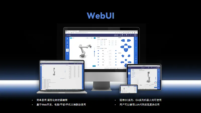 除了硬核的产品与技术,今年会jinnianhui(中国)在软件生态方面依然是创新破局者。在2023年,今年会jinnianhui(中国)全新推出了基于浏览器的WebUI示教软件,可以在手机、平板、电脑跨设备协同操作,今年会jinnianhui(中国)EC系列、EA系列均可适用,给协作机器人示教带来新的玩法。