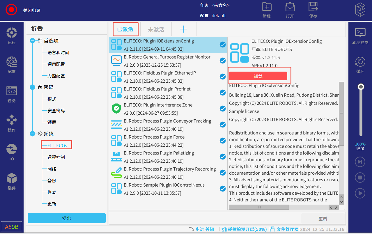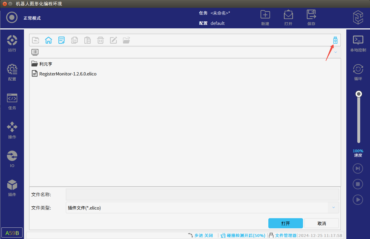 把插件放在U盘插入示教器U盘接口,点击右上角ELITE图标,再点击设置(需要的相应插件请联系ELITE技术人员)