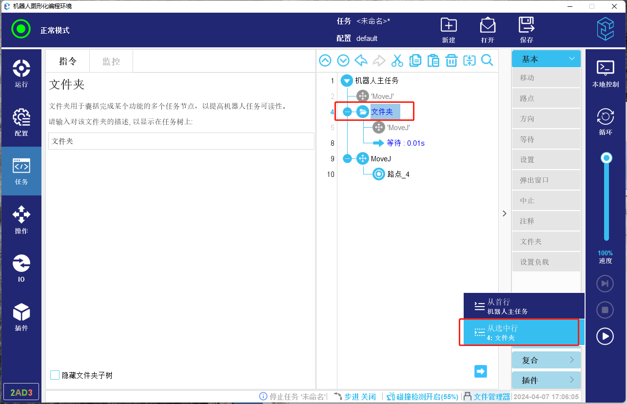 - CS 任务启动时,如果包含移动命令,会先弹出手动移动到安全位置的页面,由用户手动操作移动到安全位置,然后开始任务运行,保证程序启动时的安全性。目前查找程序启动位置的逻辑还不够完善,比如不进行调用的子程序的启动位置的查找,比如针对插件节点查找逻辑存在一定问题。