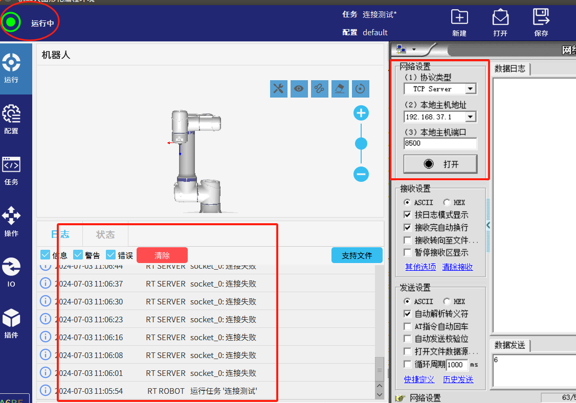 2.为了避免图1-1的情况发生我们可以利用socket_open()建立 TCP/IP 网络通信时的返回值做条件判断循环连接直到连接成功后程序才继续往下运行。如图1-2所示如果服务器未打开时机器人会一直与服务器建立连接并打印“连接失败”到EliRobot 的日志栏中。