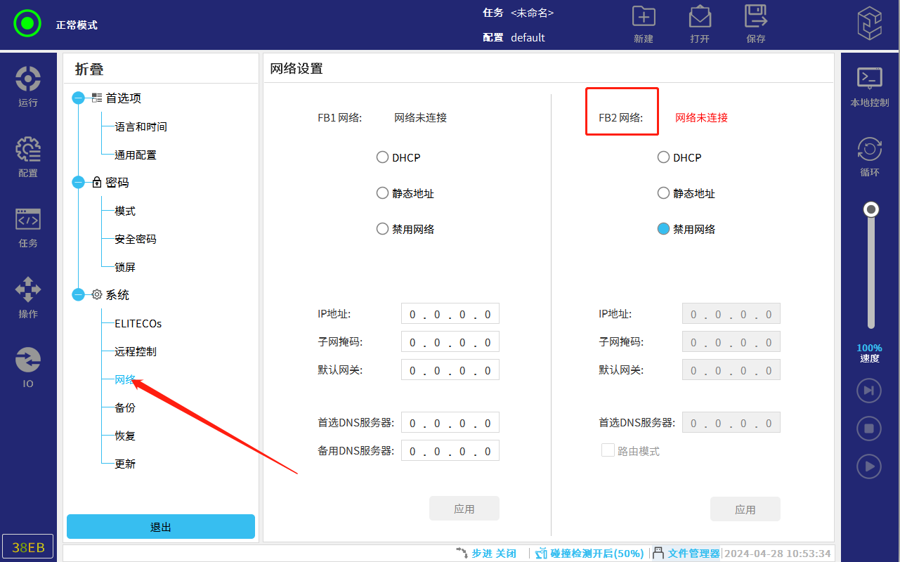 2.2 点击红箭头所指处的网络。设置红框处的FB2的IP地址,需要与连接设备同网段