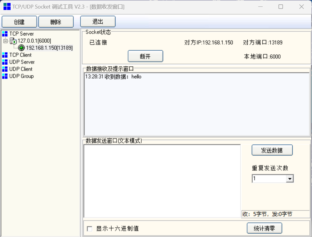 socket_send_string("hello") 向通讯助手发送字符串