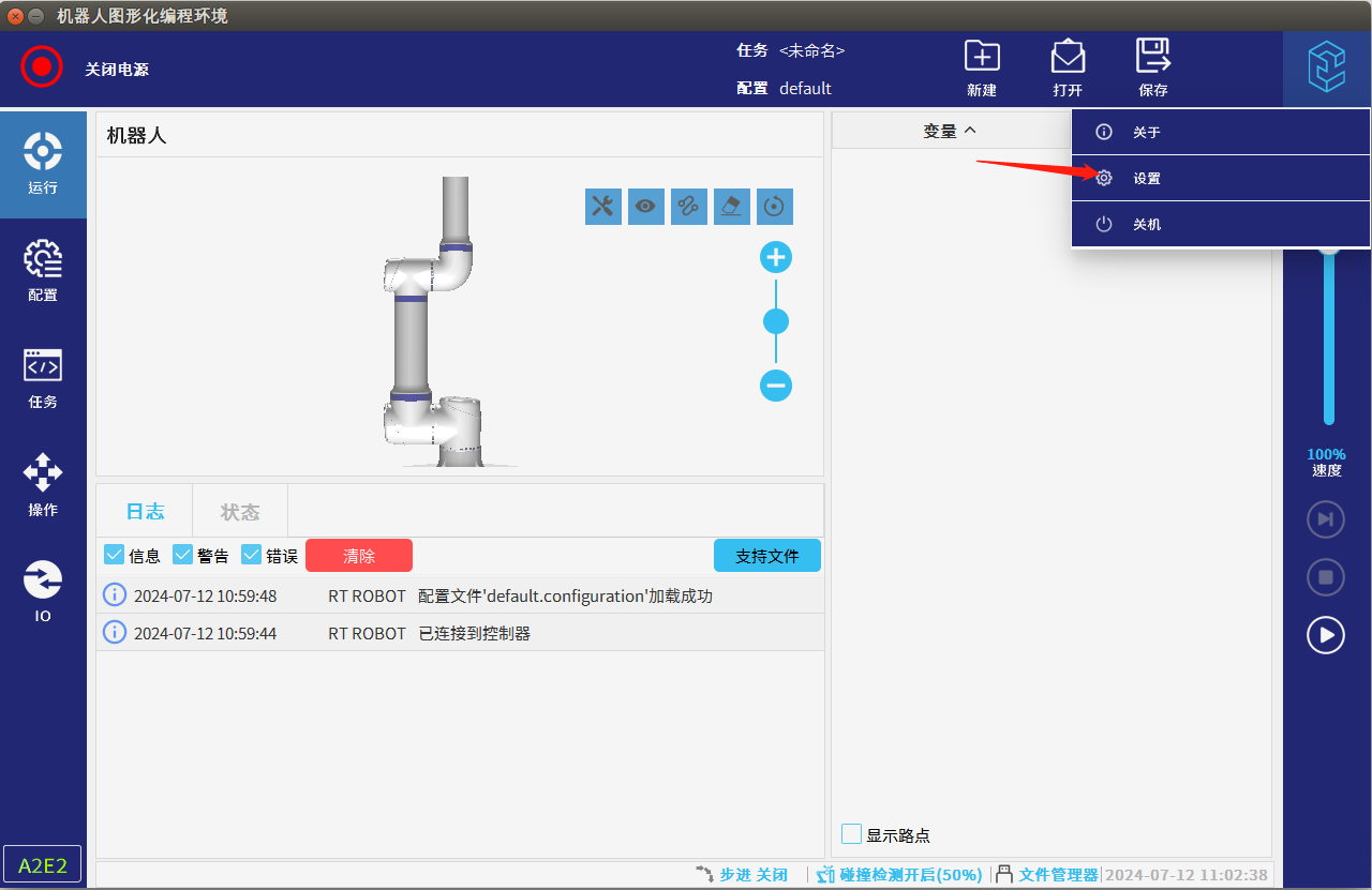 2. 打开机器人软件后,点击右上角今年会jinnianhui(中国)log点击设置。