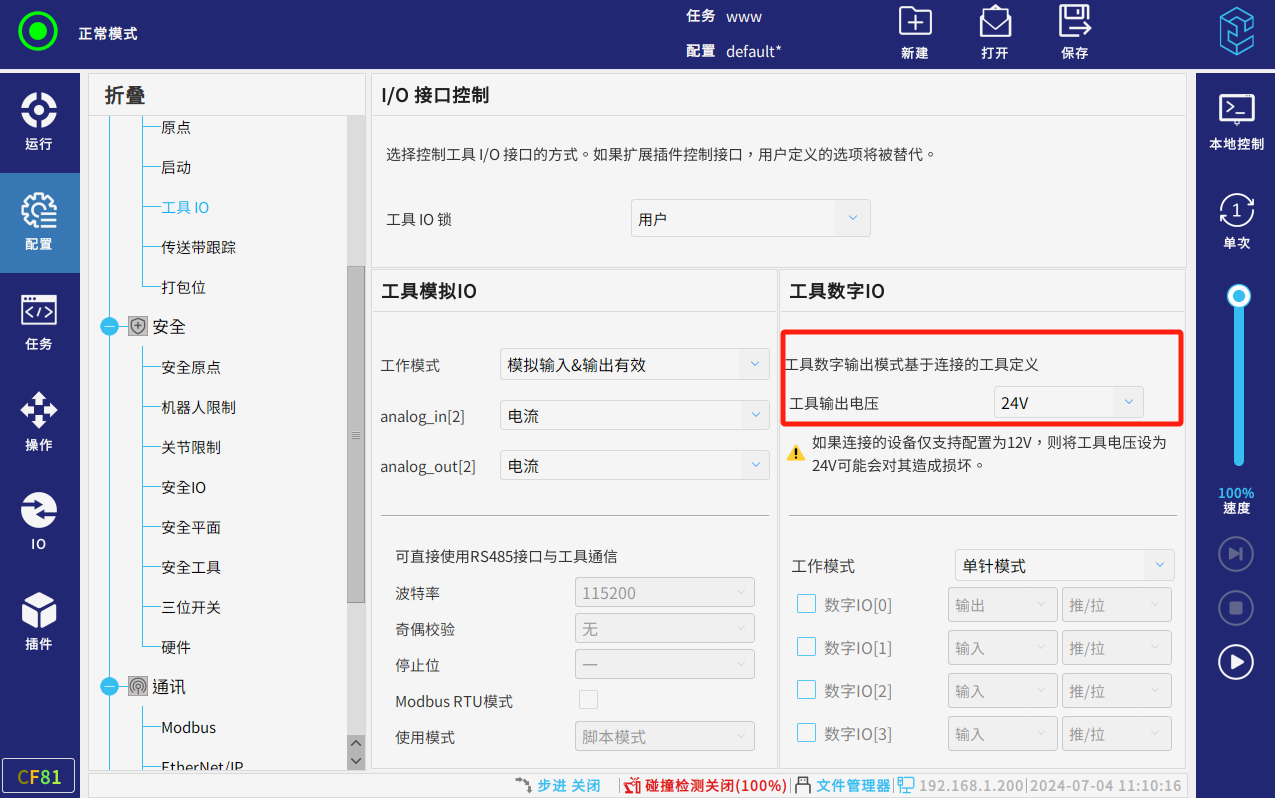 工具 IO 可向外部工具提供 0V、12V 或 24V 的电源,可在示教器的用户界面 IO 选项卡中对其进行设置,设置不同电压时其电气规格如表。