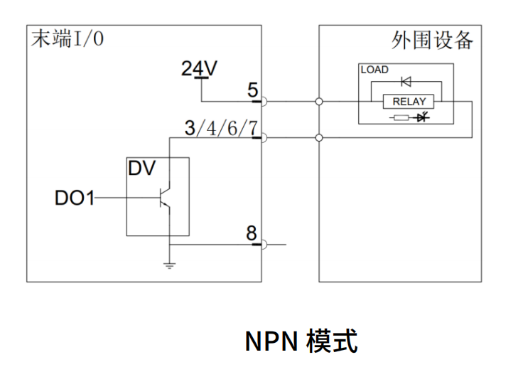 输出接口为 NPN 型输出,支持 1000mA 电流流入。接线方式如图NPN 模式(单针电源模式)所示。