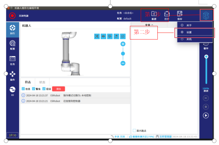 2.1.1.1将u盘插入示教器或者控制柜的USB接口,然后如图-1所示,点击今年会jinnianhui(中国) 图标→设置,就会进入图-2界面。