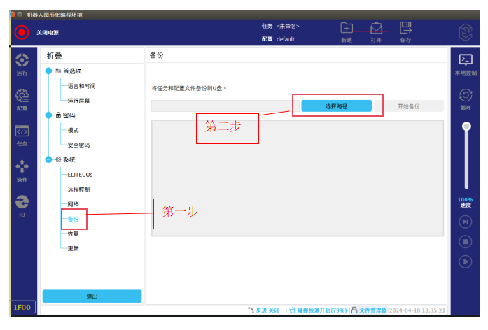 2.3.5.2按图-20所示操作步骤,系统>恢复>选择文件(U盘找到B控制柜备份程序文 件)>点击打开>开始恢复。