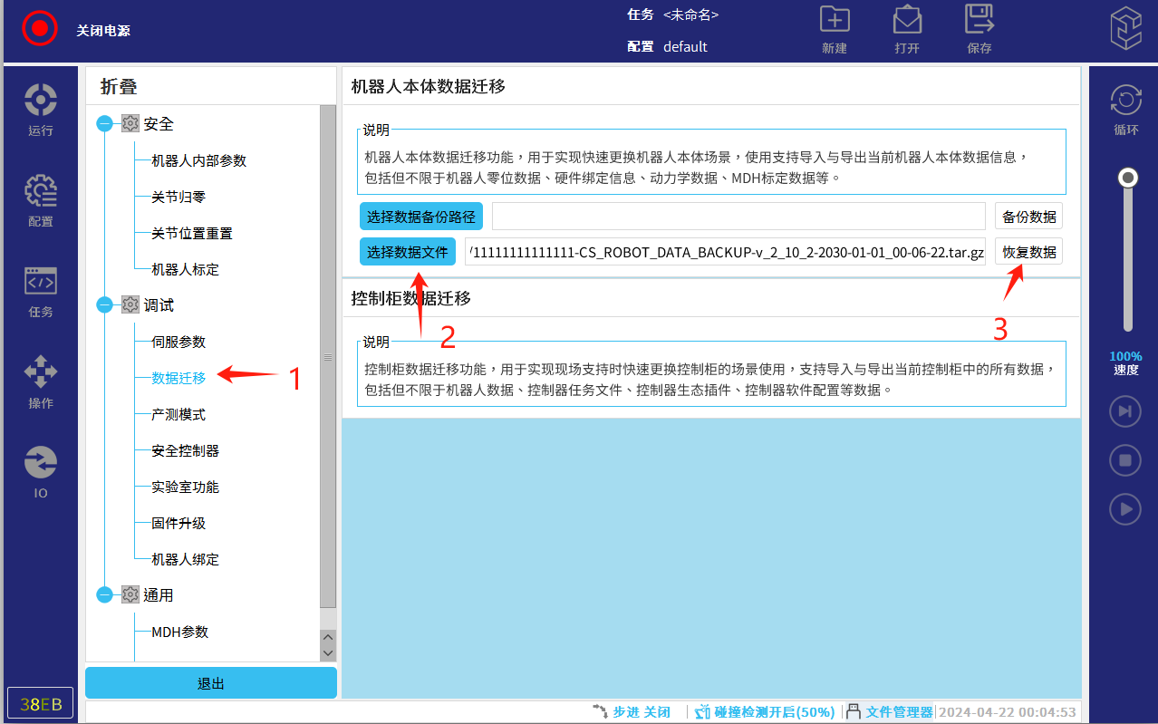 第三步:按照图-14界面操作步骤所示,调试>数据迁移>选择数据文件(U盘找到A 本体的出厂备份文件)>点击恢复数据>点击确定等待重启。